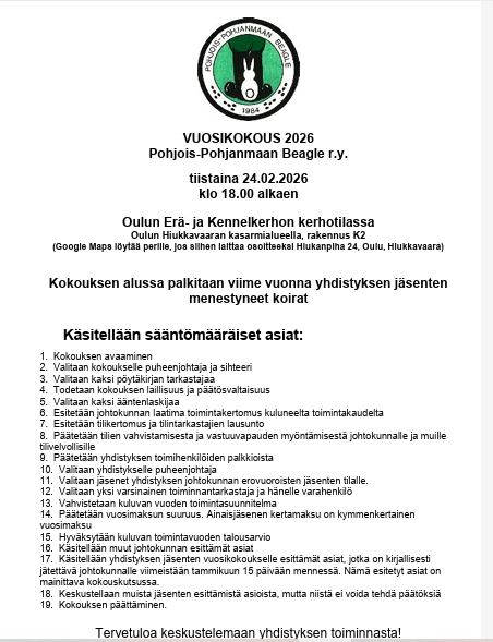 Pohjois-Pohjanmaan Beagle on perustettu vuonna 1984. Olemme paikallisyhdistys, joka yhdistää Pohjois-Pohjanmaan beagleharrastajat. Tarkoituksenamme on ylläpitää beagletoimintaa, monessa muodossa.