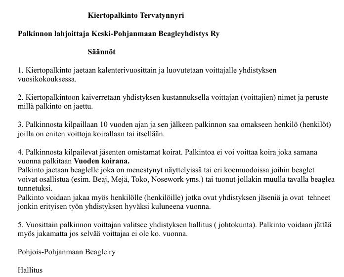 Sääntöjen 12. § 13. § ja 15. § pykälään on hyväksytty muutokset Pohjois- Pohjanmaan Beagle ry:n vuosikokouksessa helmikuun 22. päivänä 2024.