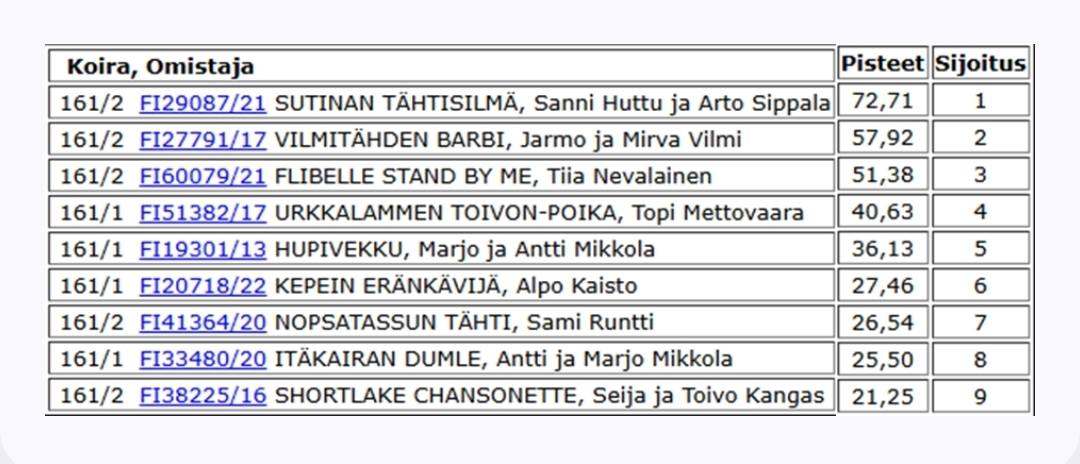 2. Vilmitähden Chanel om. Mirva ja Jarmo Vilmi 43,13p. BEAJ3.